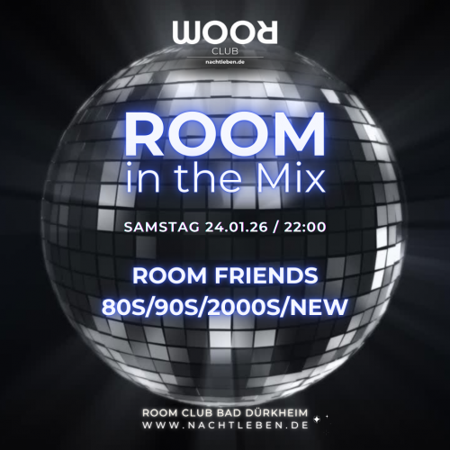 Macht euch bereit für die ultimative musikalische Mischung! Ab sofort präsentieren wir euch einmal im Monat Samstagabends eine neue Veranstaltungsreihe, die die besten Beats aus verschiedenen Genres vereint: „room in the mix“. Was euch erwartet? Mixed Music: Ein musikalischer Sound-Cocktail, der von aktuellen Hits bis zu unvergesslichen Klassikern für jeden Geschmack etwas bereithält. Hier kommt jeder auf seine Kosten! An den Decks sorgen Die ROOM Residents für die richtige Stimmung und garantieren eine volle Tanzfläche bis in die frühen Morgenstunden. Wann? 24.01.25 ab 22:00 Uhr. Wo? Im pulsierenden Room Club in Bad Dürkheim. Parkplätze direkt vor der Tür. Raucherraum im Club. Hotel direkt über unserem Club mit Special Rates auf Anfrage. Logen und Tischreservierungen unter www.nachtleben.de/packages !!! Seid dabei und erlebt eine Samstagnacht voller guter Laune, tanzbarer Rhythmen und bester Gesellschaft. Wir sehen uns auf der Tanzfläche!